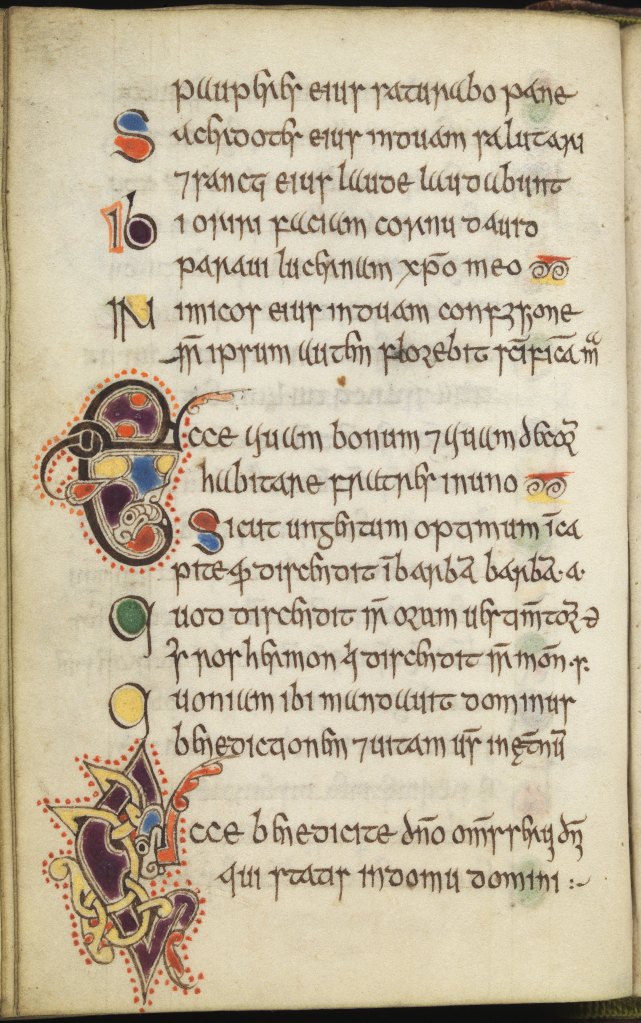 Next, Carol Farr gave an overview of the psalter’s illumination. Probably painted by a skilled artist, the initials are impressive. With Dr Farr’s analysis as guidance, it became clear to us how many different distinctive motifs one decorated letter could contain. It was especially interesting to see how these elements could be traced back to different artistic traditions, including Celtic and Scandinavian, which are also found in other Insular manuscripts from the same period. As history students who might instinctively focus on the content of the text, seeing the illustrations of a manuscript decoded and used in determining the provenance of the psalter in this way was fascinating, and showed us an entirely new approach to the non-textual side of manuscripts.
